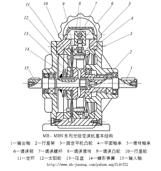 帶錐度的太陽輪12和壓盤13被一組碟形彈簧14壓緊,輸入軸15與太陽輪n鍵聯(lián)接,組成壓緊的輸入裝置。一組帶錐度的行星輪10內(nèi)側(cè)夾在壓緊的太陽輪與壓盤之間,外側(cè)夾在帶錐度的定環(huán)11和調(diào)速凸輪9之間,當(dāng)輸入裝置轉(zhuǎn)動時(shí),由于定環(huán)和調(diào)速凸輪固定不動,行星輪就沿定環(huán)作純滾動,且繞輸入軸作公轉(zhuǎn),通過行星輪軸及滑塊軸承5而帶動行星架2及輸出軸1轉(zhuǎn)l。
